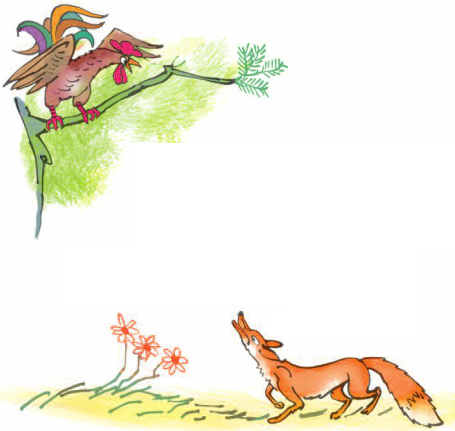 1) Để dụ Gà xuống đất, Cáo đã loan tin rằng muông thú đã kết thân, không kể mạnh yếu. Mời Gà xuống để Cáo tỏ tình cảm thân thiện.