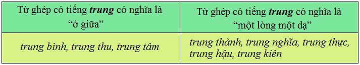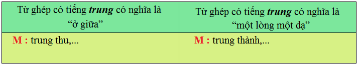 (trung bình, trung thành, trung nghĩa, trung thực, trung thu, trung hậu, trung kiên, trung tâm)