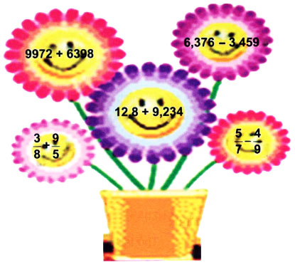 – Mỗi nhóm cử đại diện hái một bông hoa, trên đó có ghi phép tính cộng, trừ với các số tự nhiên, phân số hoặc số thập phân. Cùng nhau tính và giải thích cách thực hiện.