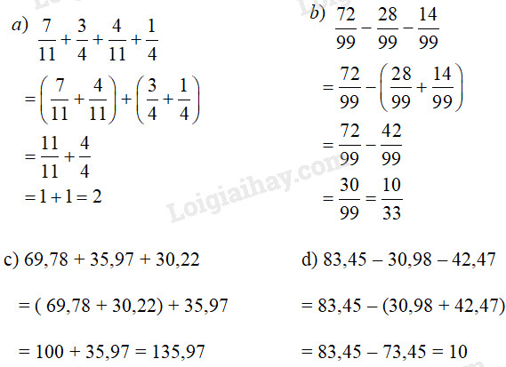 Áp dụng tính chất giao hoán và kết hợp của phép cộng để nhóm các số có tổng là số tròn trăm, tròn nghìn … hoặc nhóm các phân số, số thập phân có tổng là số tự nhiên.
