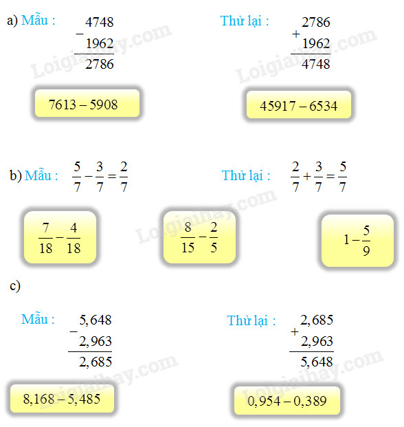 Muốn thử lại phép trừ ta có thể lấy hiệu cộng với số trừ, nếu được kết quả là số bị trừ thì phép tính làm đúng.