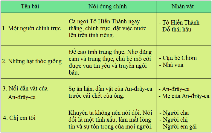Viết những điều cần nhớ về các bài tập đọc là truyện kể từ bài 4A đến bài 6C vào bảng theo mẫu sau: