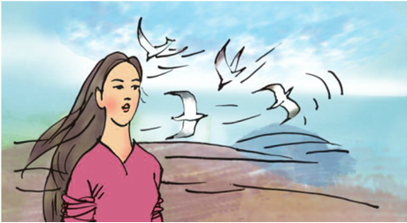 Nắng sớm đẫm chiếu người Sứ. Ánh nắng chiếu vào đôi mắt chị, tắm mượt mái tóc, phủ đầy đôi bờ vai tròn trịa của chị.