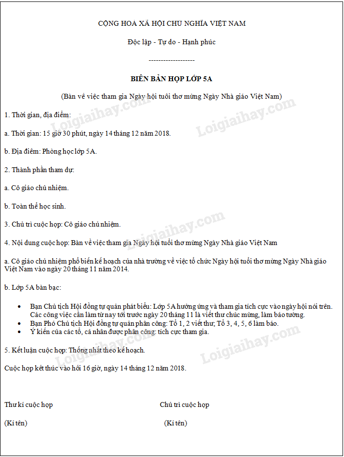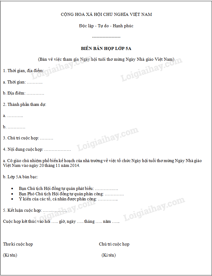 Điền vào chỗ trống những thông tin còn thiếu để hoàn thiện biên bản cuộc họp lớp bàn về việc tham gia Ngày hội tuổi thơ mừng Ngày nhà giáo Việt Nam