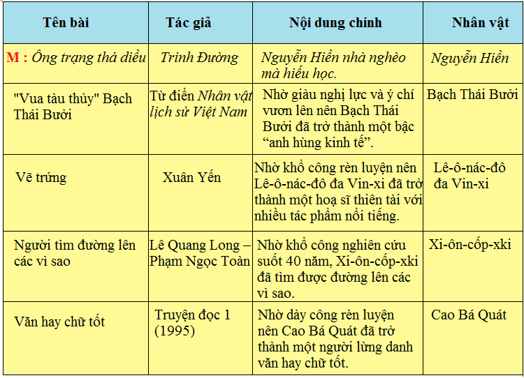 Lập bảng tổng kết các bài tập đọc là truyện kể trong chủ điểm Có chí thì nên trên bảng nhóm theo mẫu sau: