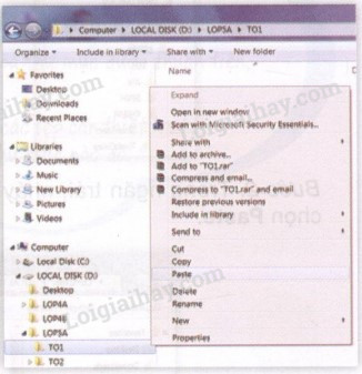 Bước 2. Trong ngăn trái nháy vào thư mục TO1 nằm trong thư mục LOP5A rồi chọn Paste (Dán).