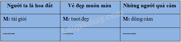 Ghi lại những điều cần nhớ về các bài tập đọc thuộc thể loại văn xuôi theo chủ điểm  Người ta là hoa đất (từ bài 19 đến bài 21) vào bảng theo mẫu: