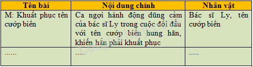 Tóm tắt vào bảng nội dung các bài tập đọc là truyện kể đã học trong chủ điểm Những người quả cảm.