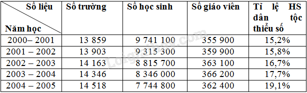 Dựa vào các số liệu dưới đây, em hãy lập bảng thống kê về tình hình phát triển giáo dục tiểu học của nước ta từ năm học 2000 – 2001 đến năm học 2004 – 2005.