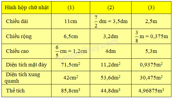 • Muốn tính diện tích một mặt ta lấy chiều dài nhân với chiều rộng tương ứng của mặt đó (vì các mặt đều có dạng hình chữ nhật).