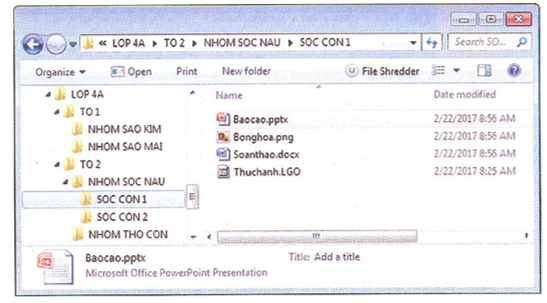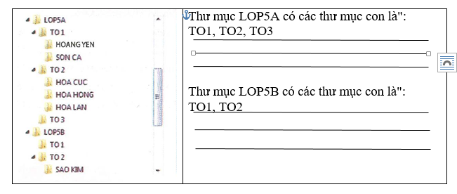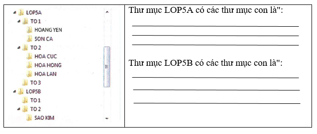 Quan sát hình dưới rồi ghi tên các thư mục con của hai thư mục LOP 5A, LOP5B vào chỗ trống