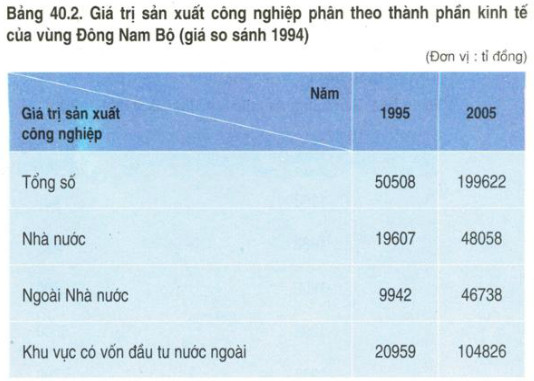 –   So với năm 1995, giá trị sản xuất công nghiệp của vùng Đông Nam Bộ năm 2005 tăng gấp 3,95 lần (từ 50.508 tỉ đồng năm 1995 lên 199.622 tỉ đồng năm 2005).