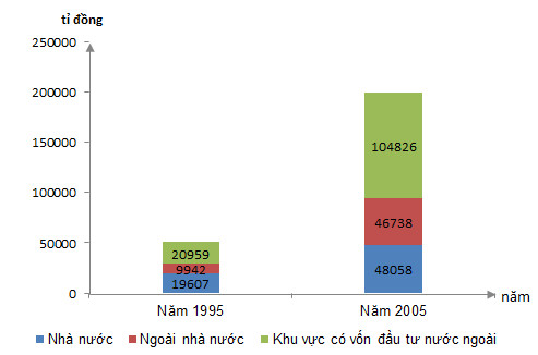 + Khu vực ngoài Nhà nước tăng gấp 4,7 lần (từ 9.942 tỉ đồng năm 1995 lên 46.738 tỉ đồng năm 2005), cao hơn mức tăng giá trị sản xuất công nghiệp của vùng (3,95 lần).