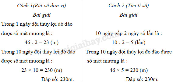 Một đội thủy lợi trong 2 ngày đào được 46m mương. Hỏi trong 10 ngày đội thủy lợi đó đào được bao nhiêu mét mương? (Biết rằng số mét mương đào được mỗi ngày như nhau).