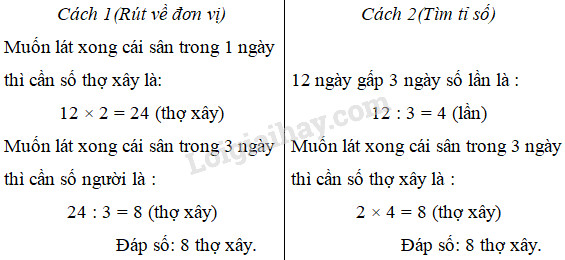 – Cách 2 : Tìm tỉ số : 12 ngày gấp 3 ngày bao nhiều lần thì số thợ xây cần có để lát xong cái sân trong 3 ngày cũng gấp lên bấy nhiêu lần.