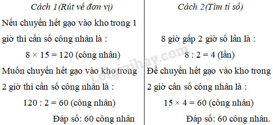 – Cách 2 : Tìm tỉ số : 8 giờ gấp 2 giờ bao nhiều lần thì số công nhân cần có để chuyển hết gạo vào kho trong 2 giờ cũng gấp lên bấy nhiêu lần.