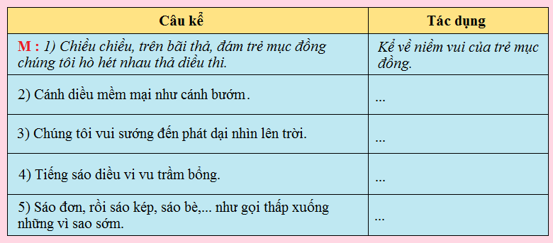 (1) Chiều chiều, trên bãi thả, đám trẻ mục đồng chúng tôi hò hét nhau thả diều thi. (2) Cánh diều mềm mại như cánh bướm. (3) Chúng tôi vui sướng đến phát dại nhìn lên trời. (4) Tiếng sáo diều vi vu trầm bổng. (5) Sáo đơn, rồi sáo kép, sáo bè,… như gọi thấp xuống những vì sao sớm.