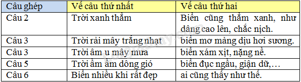 (1) Biển luôn thay đổi màu tùy theo sắc mây trời. (2) Trời xanh thẳm, biển cũng thẳm xanh, như dâng cao lên, chắc nịch. (3) Trời rải mây trắng nhạt, biển mơ màng dịu hơi sương. (4) Trời âm u mây mưa, biển xám xịt, nặng nề. (5) Trời ầm ầm dông gió, biển đục ngầu, giận dữ,… (6) Biển nhiều khi rất đẹp, ai cũng thấy như thế. (7) Nhưng vẻ đẹp của biển, vẻ đẹp kì diệu muôn màu muôn sắc ấy phần rất lớn là do mây, trời và ánh sáng tạo nên.