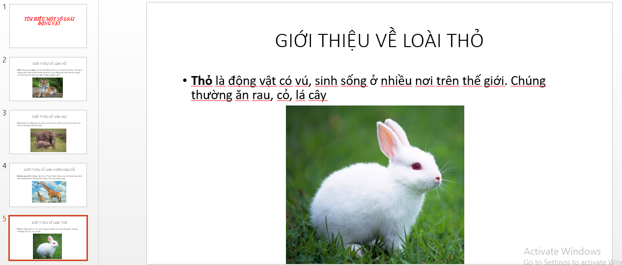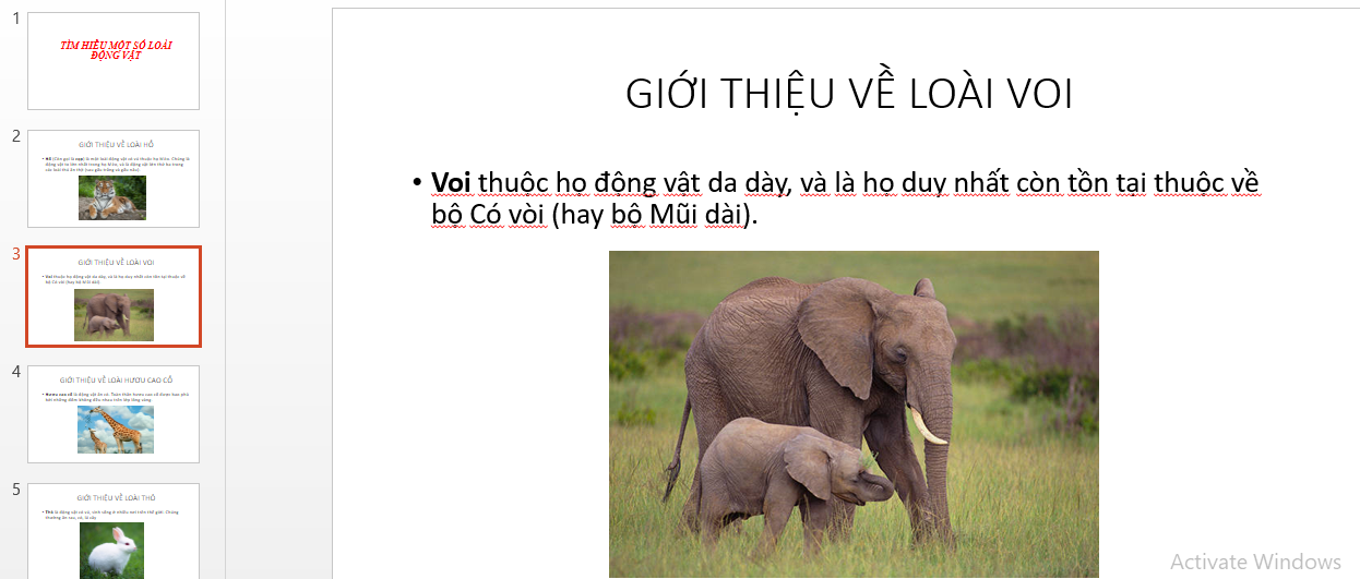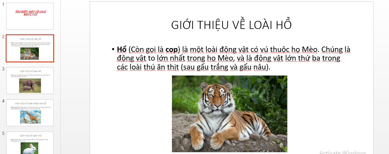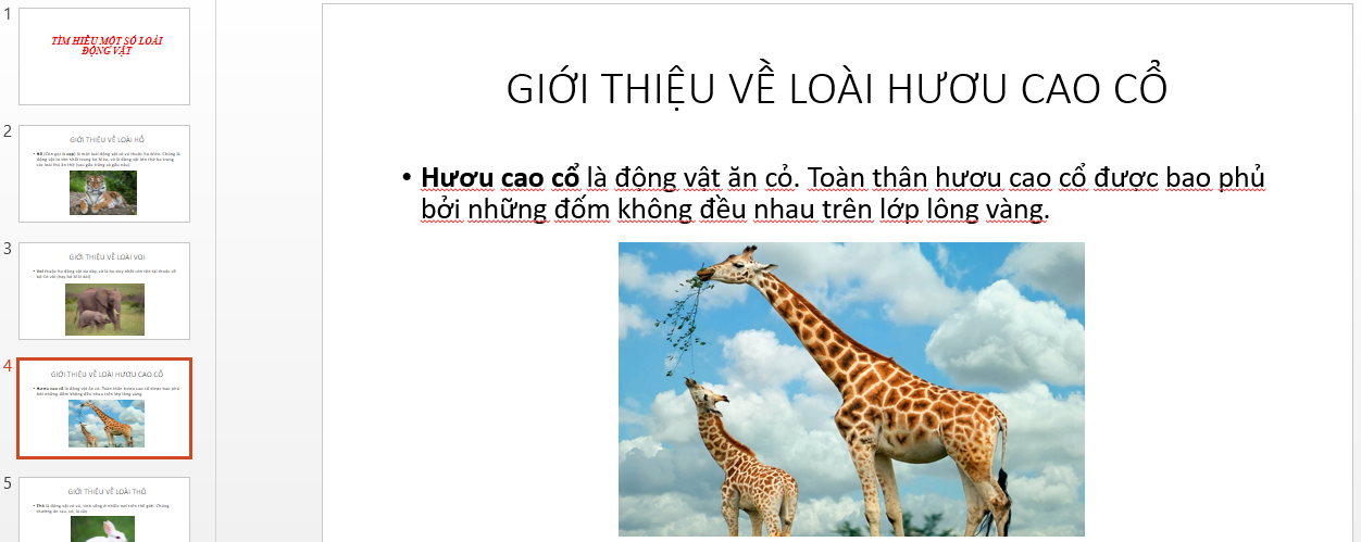Tìm kiếm hình ảnh từ Internet về các loài vật như Hổ, Voi, Hươu cao cổ, Thỏ rồi chèn vào từng trang giới thiệu các loài vật theo mẫu