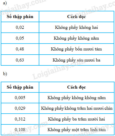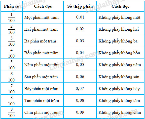 – \(0,01\) đọc là “không phẩy không một”.  Các số thập phân khác đọc tương tự.
