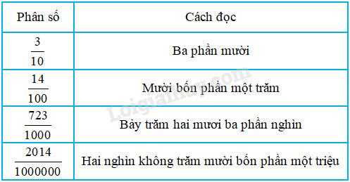 Năm phần mười; bảy mươi hai phần một trăm; ba trăm phần nghìn; chín phần một triệu.