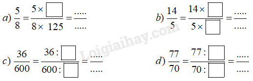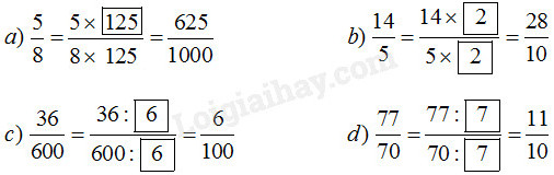 Nhân (hoặc chia) cả tử và mẫu số của một phân số với cùng một số tự nhiên khác \(0\) để được phân số có mẫu số là \(10\,;\,\,100;,\,1000; \,\,…\) .