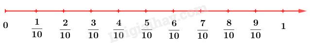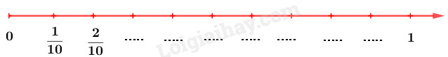 Quan sát tia số ta thấy \(1\) đơn vị được chia thành \(10\) phần bằng nhau, hay mỗi phần có giá trị là \(\dfrac{1}{{10}}\), từ đó ta viết được phân số thập phân thích hợp vào chỗ chấm dưới mỗi vạch của tia số.