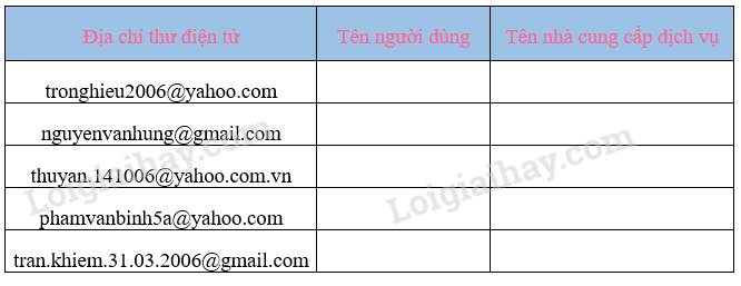Điền tên người dùng, tên nhà cung cấp dịch vụ thư điện tử vào ô trống trong bảng sau: