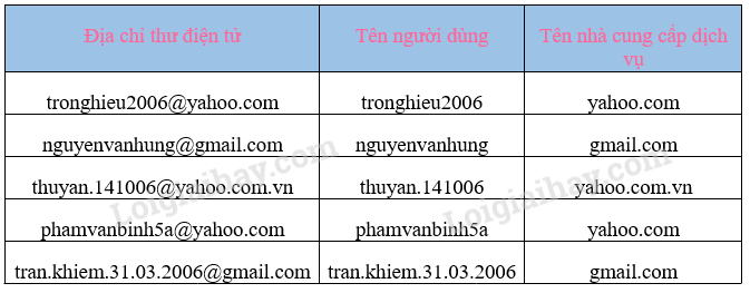 Giải phần B. Hoạt động thực hành bài 3 trang 18, 19, 20, 21, 22, 23, 24 sách hướng dẫn học tin học lớp 5. Điền tên người dùng, tên nhà cung cấp dịch vụ thư điện tử vào ô trống trong bảng sau: . .