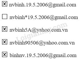 Bạn Nguyễn Văn Bình sinh ngày 19 tháng 5 năm 2006, học lớp 5a.Hãy giúp Bình chọn các địa chỉ thư có cấu trúc hợp lệ: