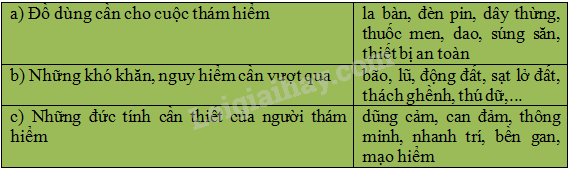 Em dựa vào hiểu biết của bản thân về các hoạt động thám hiểm để tìm các từ ngữ liên quan cho phù hợp.