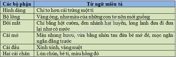 Chúng có bộ lông vàng óng. Một màu vàng đáng yêu như màu của những con tơ nõn mới guồng. Nhưng đẹp nhất là đôi mắt với cái mỏ. Đôi mắt chỉ bằng hột cườm, đen nhánh hạt huyền, lúc nào cũng long lanh đưa đi đưa lại như có nước, làm hoạt động hai con ngươi bóng mỡ. Một cái mỏ màu nhung hươu, vừa bằng ngón tay đứa bé mới đẻ và có lẽ cũng mềm như thế, mọc ngăn ngắn đằng trước. Cái đầu xinh xinh, vàng nuột và ở dưới bụng, lủn chủn hai cái chân bé tí màu đỏ hồng.