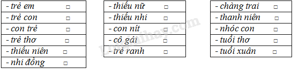 Trong các từ dưới đây, từ nào đồng nghĩa với từ trẻ em? Đánh dấu x vào ô trống thích hợp: