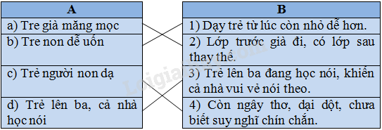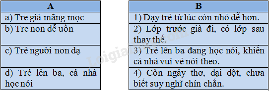 Nối từng thành ngữ, tục ngữ ở cột A với nghĩa thích hợp ở cột B. Viết kết quả vào vở.