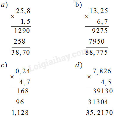 a) Đặt tính rồi tính theo cách thực hiện phép nhân số thập phân với số thập phân.