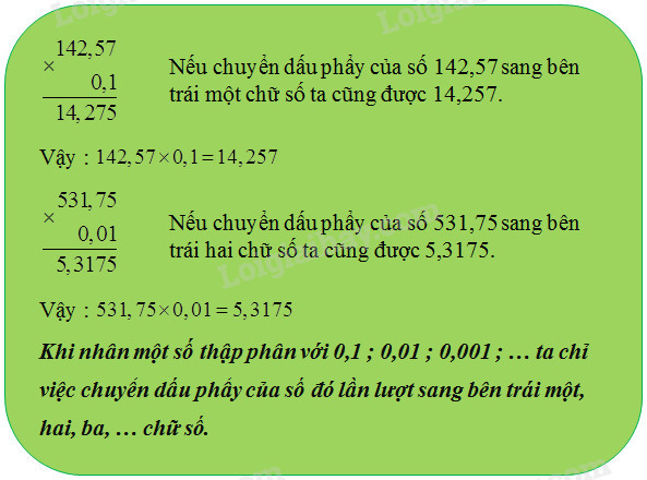 – Đếm xem trong phần thập phân của cả hai thừa số có bao nhiêu chữ số rồi dùng dấu phẩy tách ở tích ra bấy nhiêu chữ số kể từ phải sang trái.