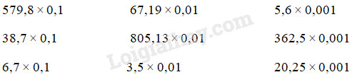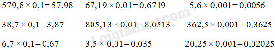 \(\dfrac{{ \times \begin{array}{*{20}{r}}{142,57}\\{0,1}\end{array}}}{{\begin{array}{*{20}{r}}{14257}\\{00000\,\,\,}\\\hline{014,257}\end{array}}}\,\,\,\,\,\,\,\,\,\,\,\,\,\,\,\,\,\,\,\,\,\,\,\,\,\,\,\,\,\,\,\,\,\,\,\,\dfrac{{ \times \begin{array}{*{20}{r}}{531,75}\\{0,01}\end{array}}}{{\begin{array}{*{20}{r}}{\,\,\,\,53175}\\\begin{array}{l}\;\,00000\,\,\\00000\,\,\,\;\end{array}\\\hline{005,3175}\end{array}}}\)