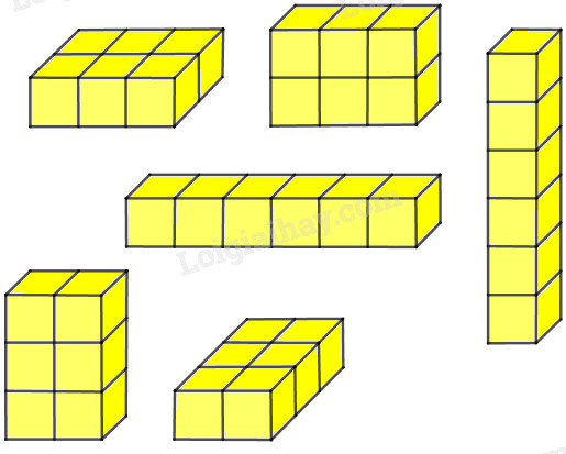 Phân tích 6 = 1 × 6 = 2 × 3, từ đó tìm được các cách để xếp 6 hình lập phương đã cho thành một hình hộp chữ nhật.
