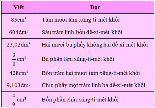 Để đọc (hoặc viết) các số đo thể tích ta đọc (hoặc viết) số đo trước, sau đó đọc (hoặc viết) tên đơn vị thể tích thích hợp.