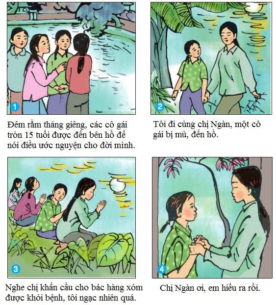 – Em ạ, nhà chị Yên xóm mình nghèo nhất làng. Năm ngoái chị Yên tròn mười lăm tuổi. Đêm rằm tháng Giêng, mẹ chị ấy đổ bệnh, chị ấy phải chăm sóc mẹ suốt đêm. Khi trăng lặn, biết mình không có cơ hội nói điều ước thiêng liêng, chị ấy đã khóc như mưa. Nay mẹ chị ấy vẫn bệnh, chị ước thay cho chị Yên. Chị mồ côi mẹ nên chị hiểu nỗi bất hạnh khi không còn mẹ.