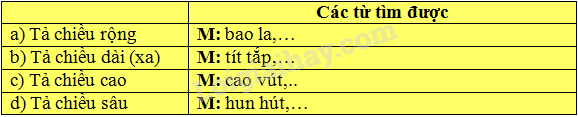 Tìm những từ ngữ miêu tả không gian rồi viết vào phiếu hoặc vở (theo mẫu)