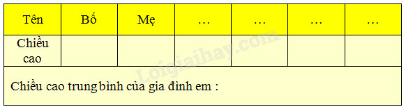– Để tìm chiều cao trung bình của gia đình em ta lấy tổng số đo chiều cao của các thành viên trong gia đình em chia cho tổng số thành viên trong gia đình em.