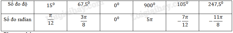 1, \({15^0} = 15.\frac{\pi }{{{{180}^0}}} = \frac{\pi }{{12}}\).