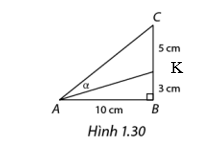 \(\begin{array}{l}\tan \widehat {CAB} = \frac{{BC}}{{AB}} = \frac{{CK + BK}}{{AB}} = \frac{8}{{10}}\\\tan \widehat {KAB} = \frac{{BK}}{{AB}} = \frac{3}{{10}}\\\tan \alpha  = \tan \left( {\widehat {CAB} – \widehat {KAB}} \right) = \frac{{\tan \widehat {CAB} – \tan \widehat {KAB}}}{{1 + \tan \widehat {CAB}\tan \widehat {KAB}}} = \frac{{25}}{{62}}\end{array}\)