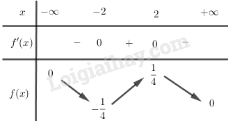 Hàm số đạt cực đại tại điểm \(x =  – 2;{\rm{ }}f\left( { – 2} \right) =  – {1 \over 4}\) và đạt cực tiểu tại điểm \(x = 2;{\rm{ }}f\left( 2 \right) = {1 \over 4}\)