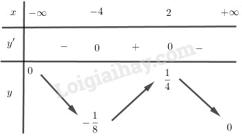 Hàm số đạt cực đại tại \(x = 2\), cực tiểu tại \(x = – 4\) và \({y_{CD}} = y(2) = {1 \over 4};{y_{CT}} = y( – 4) =  – {1 \over 8}\)
