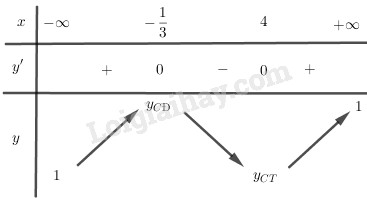 Hàm số đạt cực đại tại \(x =  – {1 \over 3}\) , đạt cực tiểu tại \(x = 4\) và \({y_{CD}} = y( – {1 \over 3}) = {{13} \over 4};{y_{CT}} = y(4) = 0\)