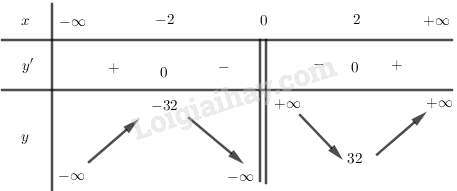 \(y’ = 0 \Leftrightarrow {x^2} – 4 = 0 \Leftrightarrow x =  \pm 2\).