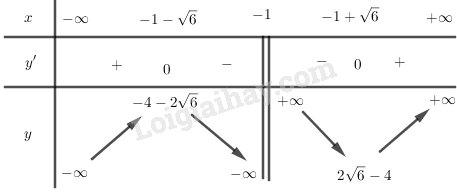 và nghịch biến trên các khoảng \(( – 1 – \sqrt 6 ; – 1), ( – 1; – 1 + \sqrt 6 )\)