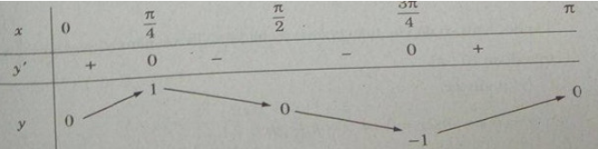 y’ = 0 \( \Leftrightarrow \left[ \begin{array}{l}x = \frac{\pi }{4}\\x = \frac{{3\pi }}{4}\end{array} \right.\)